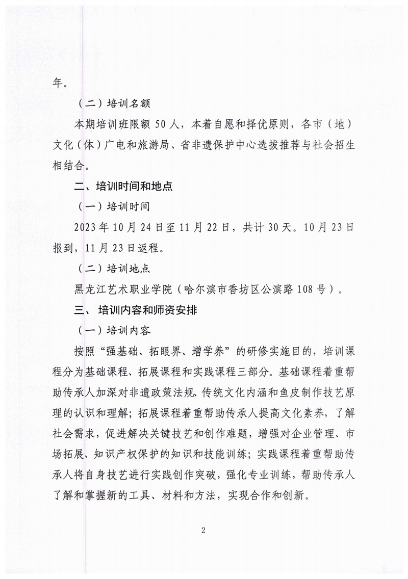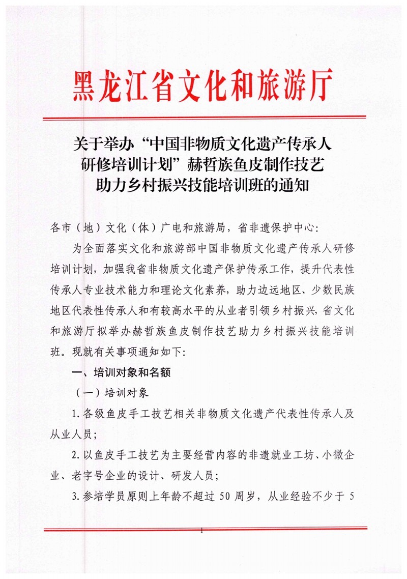 关于举办“中国非物质文化遗产传承人 研修培训计划”赫哲族鱼皮制作技艺 助力乡村振兴技能培训班的通知