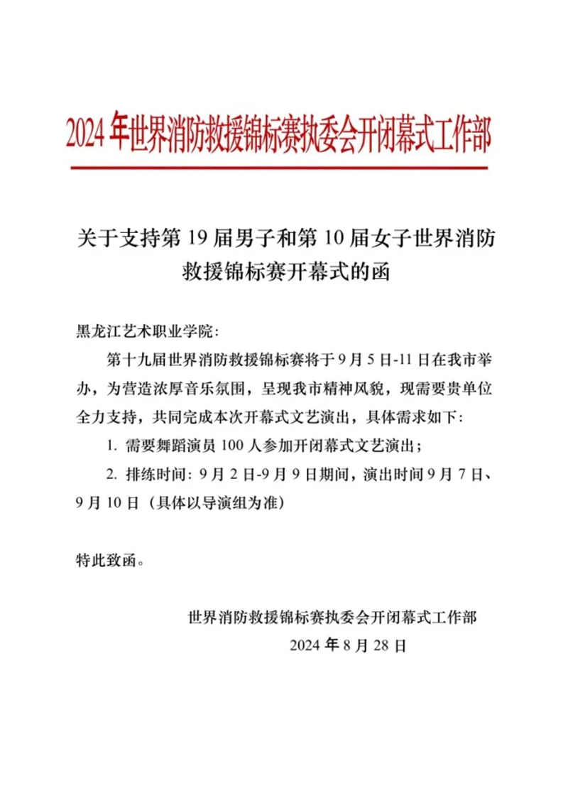 近日,由应急管理部、国家消防救援局、黑龙江省人民政府主办,哈尔滨市人民政府承办的第19届男子和第10届女子世界消防救援锦标赛在黑龙江省哈尔滨市举办,学院舞蹈系百余名师生受邀参加开闭幕式文艺演出。本次世锦赛作为一场集竞技、交流、文化展示于一体的国际盛会,共有11个国家参赛,9个国家和国际组织及中国香港、澳门消防部门现场观摩,总人数320余人。